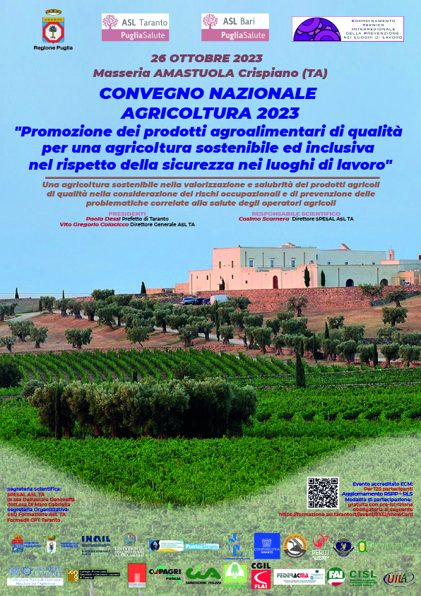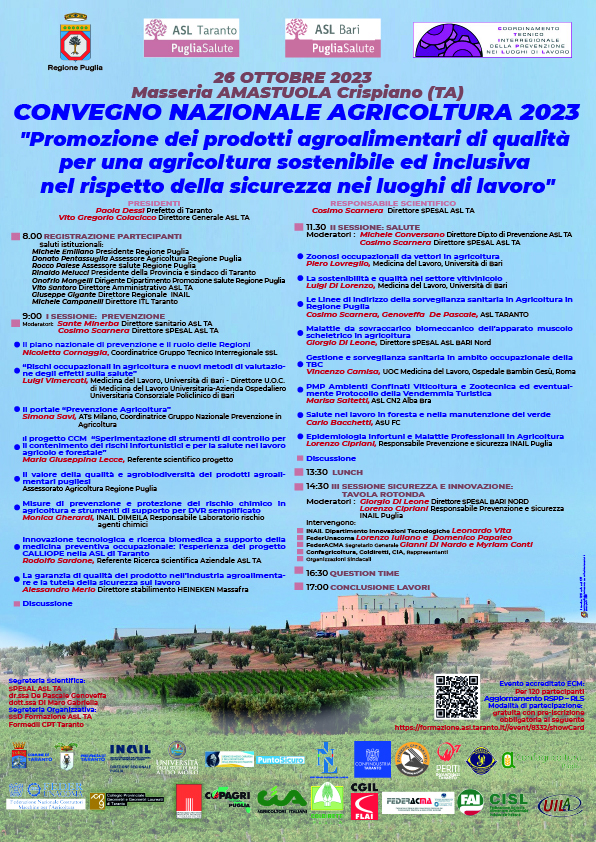 La Regione Puglia, l’Assessorato Agricoltura e Assessorato alla Salute, Dipartimento Promozione della Salute e del Benessere Animale Regionale con l’ASL TA/SPESAL, l’ASL Bari /SPESAL Area Nord e il Coordinamento Tecnico Interregionale della Prevenzione nei Luoghi di Lavoro hanno organizzato, in occasione della settimana europea per la sicurezza e la salute sul lavoro ed in linea con il Piano Nazionale (PNP) e Regionale di Prevenzione (PRP), il “CONVEGNO NAZIONALE AGRICOLTURA 2023. "Promozione dei prodotti agroalimentari di qualità per una agricoltura sostenibile ed inclusiva nel rispetto della sicurezza nei luoghi di lavoro", con la partecipazione delle Istituzioni, interessate, Università di Bari, INAIL, INAIL DiMeila, Ordini Professionali e Associazioni di Categoria. In tale evento saranno sviluppate tematiche riguardanti programmi di promozione che riguardano l’Agricoltura sostenibile per la valorizzazione e salubrità dei prodotti agricoli di qualità, utilizzo dei fitosanitari, promozione del lavoro agricolo di qualità con finalità di pubblico interesse nel rispetto delle disposizioni Comunitarie, Nazionali e Regionali vigenti in materia. Si tratterà dei rischi occupazionali in agricoltura del loro controllo e contenimento e delle misure di prevenzione oltre che delle problematiche correlate alla salute degli operatori agricoli (zoonosi, sorveglianza sanitaria, MSK, etc.) Il convegno a valenza Nazionale vuole rappresentare un importante momento di confronto per delineare soluzioni per le principali criticità relative alle macchine e delle attrezzature agricole e presentare buone pratiche e strumenti di controllo applicabili in modo omogeneo nei vari ambiti territoriali per la prevenzione degli infortuni e delle patologie da lavoro nel contesto agricolo, forestale e di manutenzione del verde. |